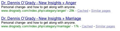 The results from doing a site:yourdomain.com search for a site using the Blue Horizon theme which has bad header tags that put the tagline in instead of content.
